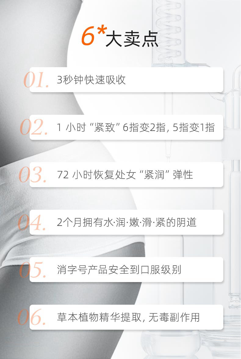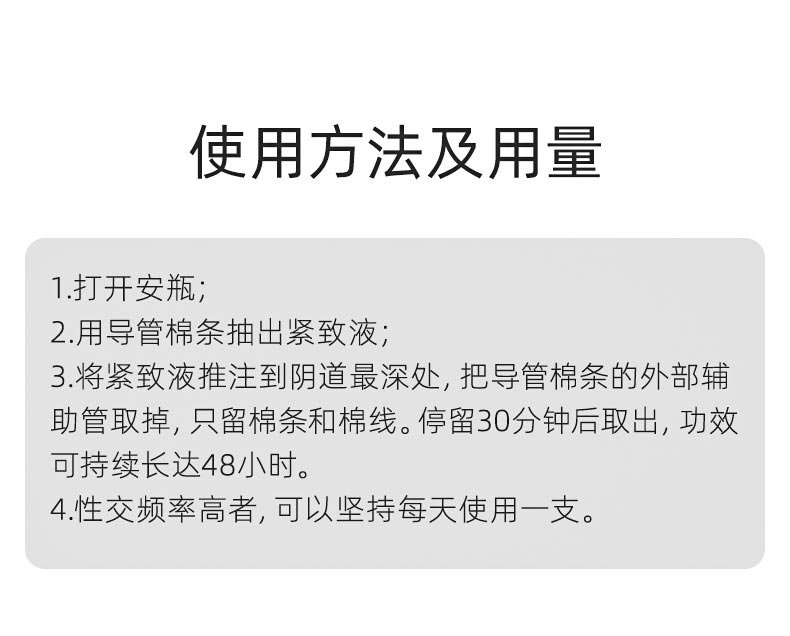 使用方法:清洗双手及私处皮肤,打开安瓶用导管棉条抽取产品,将导管推入阴道深处后将外部辅助管取出,只留棉条和棉线待产品充分吸收后轻拉棉线,将棉条取出